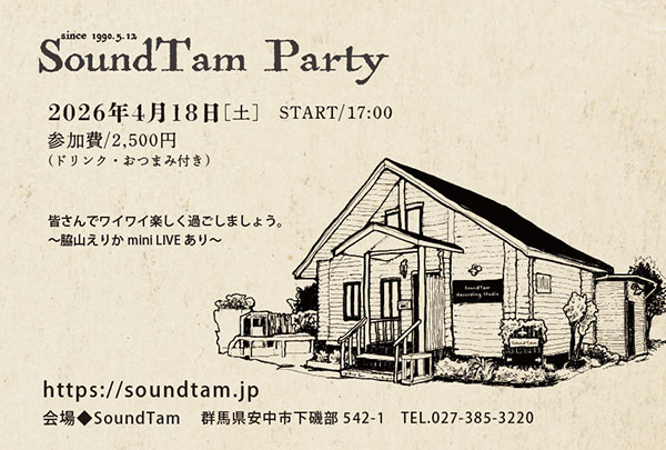 ![]() *2011年から始めたスタジオライブ、2013年からはSoundTam LIVEとして飲食の提供を行ってきましたが、今年4月末日をもって飲食業は廃止することといたしました。5月からのライブでは飲食提供はありません。(ソフトドリンク、酒類の持ち込み可) もちろん録音スタジオとしての業務やライブは続けて、CDも変わりなく制作いたします。 これからも頑張っていきますので、よろしくお願いいたします**************************************** LIVEご予約は下記「ご予約フォーム」で |
